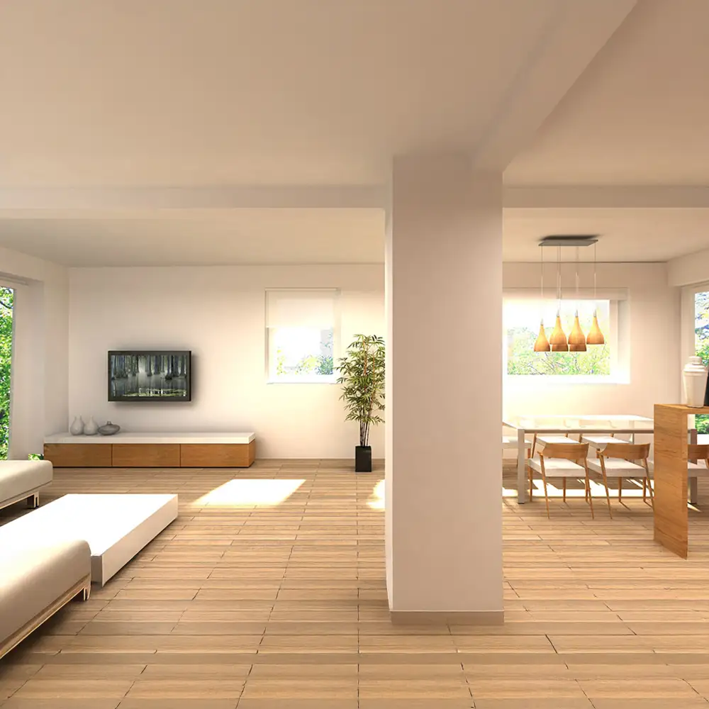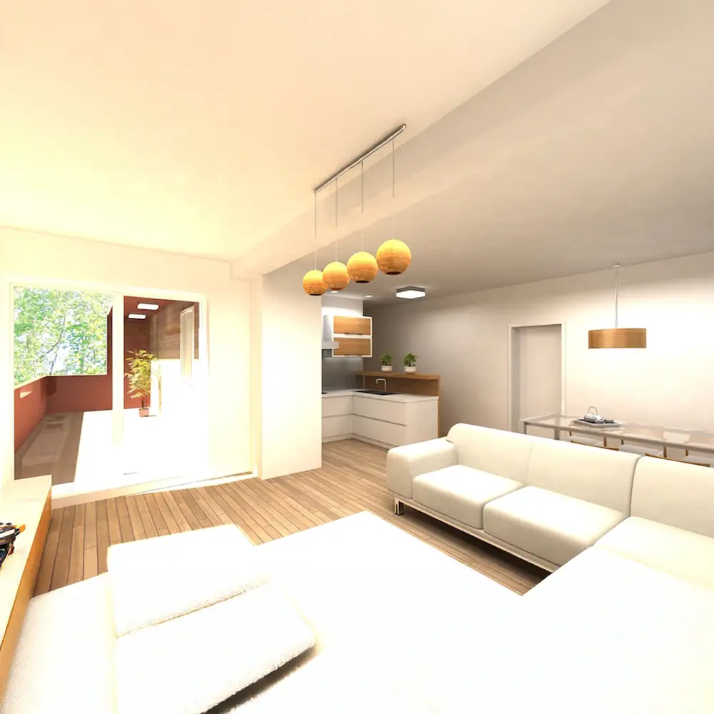 Bei der großzügig geplanten Familienwohnung begeistert der Wohnbereich von fast 45 m2 und überdurchschnittlicher Raumhöhe. Mit großen Fensterflächen ausgestattet schafft dieser Lebensraum ein freies Wohngefühl mit direktem Zugang zu Terrasse und Garten.
