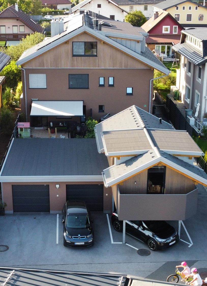 Das Kleinwohnhaus wurde entkernt und von Grund auf komplett neu als Niedrigenergiehaus errichtet und wird mittels Luftwärmepumpe und Photovoltaik energetisch versorgt.
